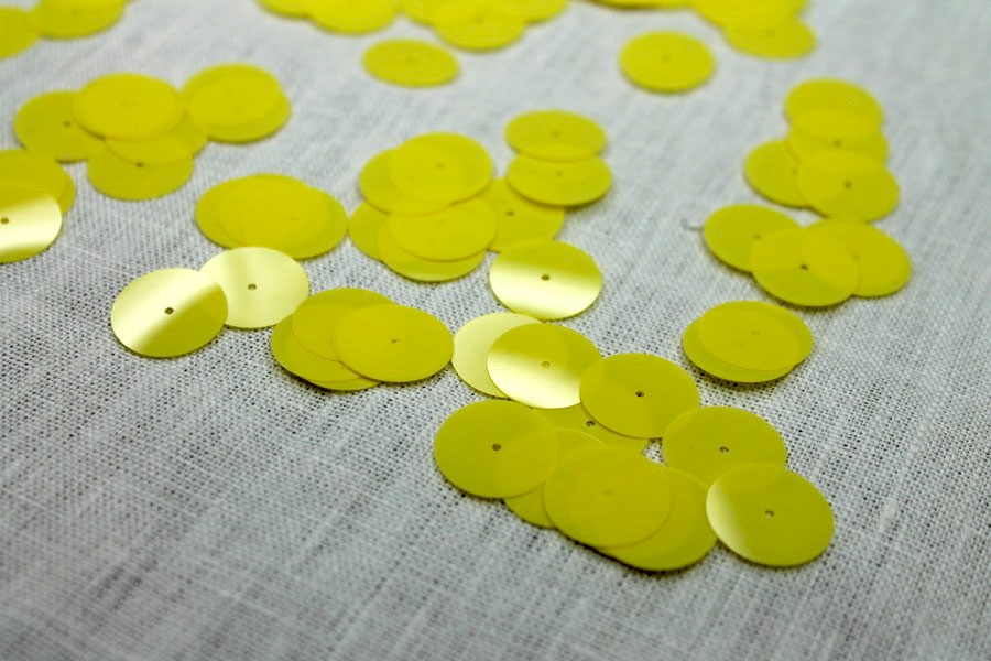 This is of loose plastic sequins in bright yellow, about 1.5cm across with the hole in the centre. Sold in bags of 30g, over 600 sequins in each bag.