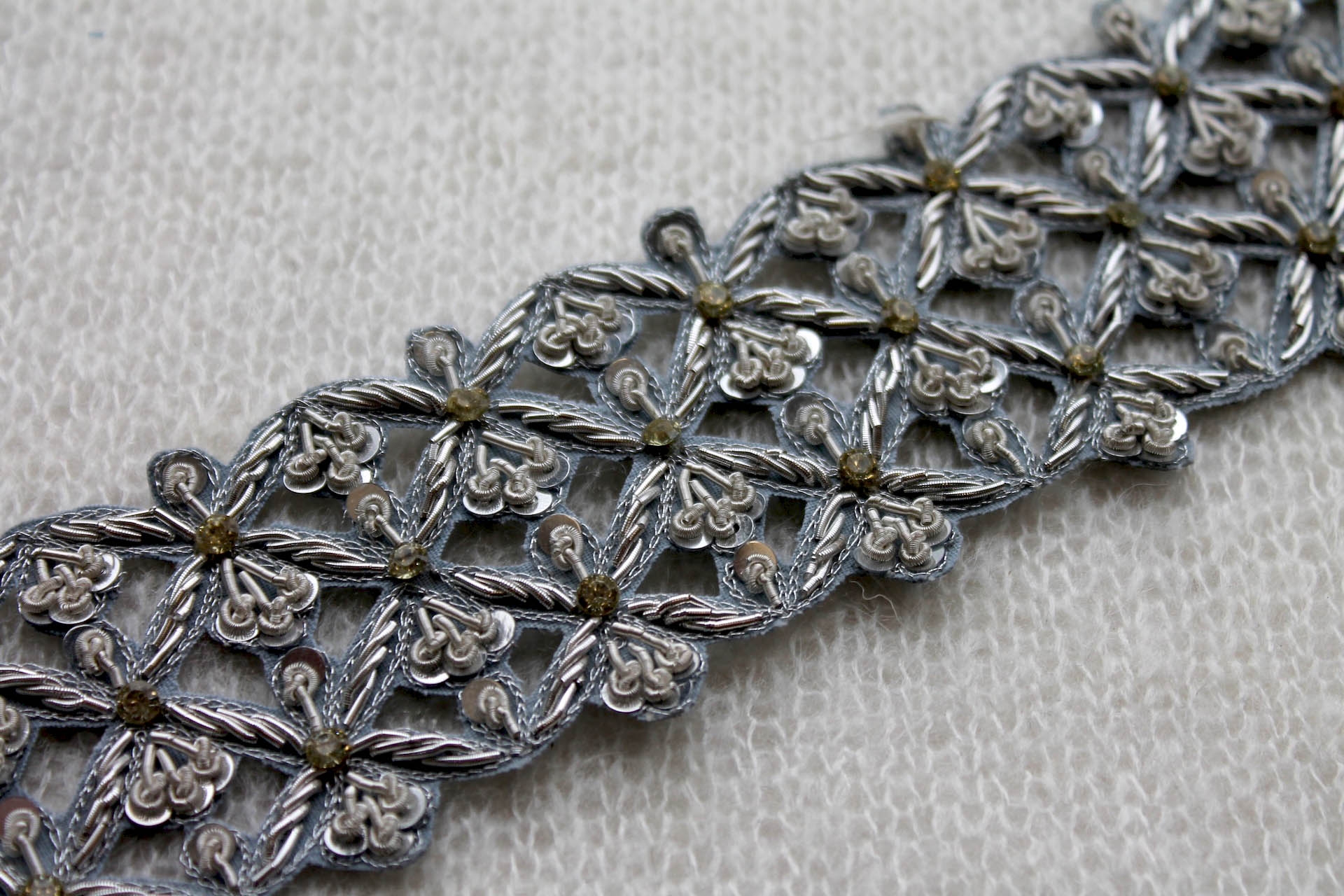 A zari work trim in pale blue made with tiny metallic springs in silver with silver sequins in a trellis pattern.