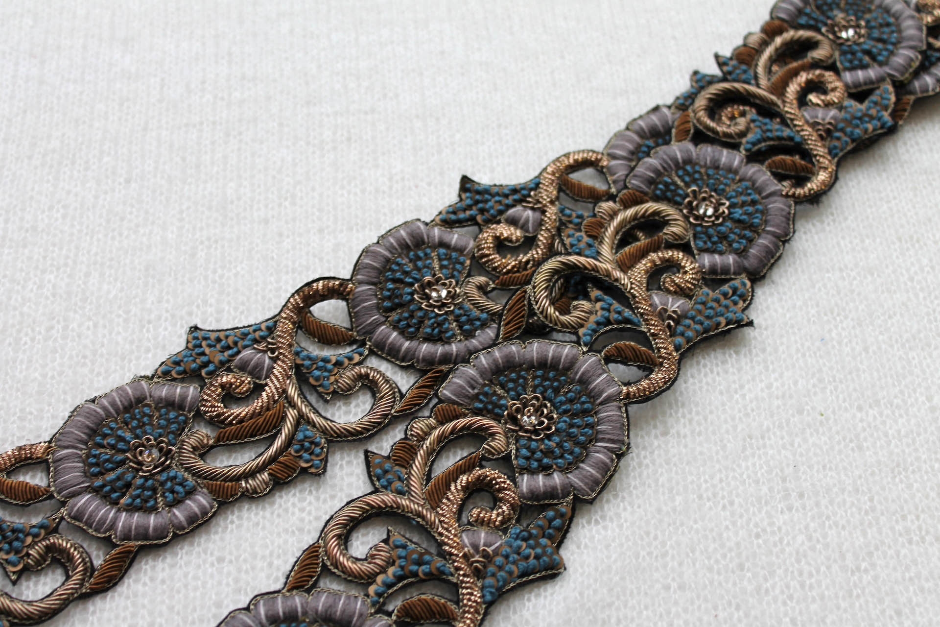 A zari work trim made with tiny metallic springs in gold with grey flowers, brown detail thread, and gold and copper zari work and sequins.