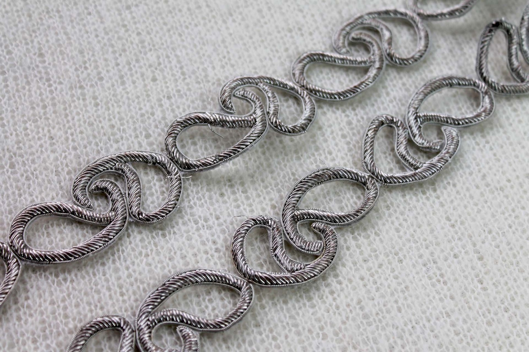 A silver paisley zari work trim made with tiny metallic silver springs. Trim measures 4cm.